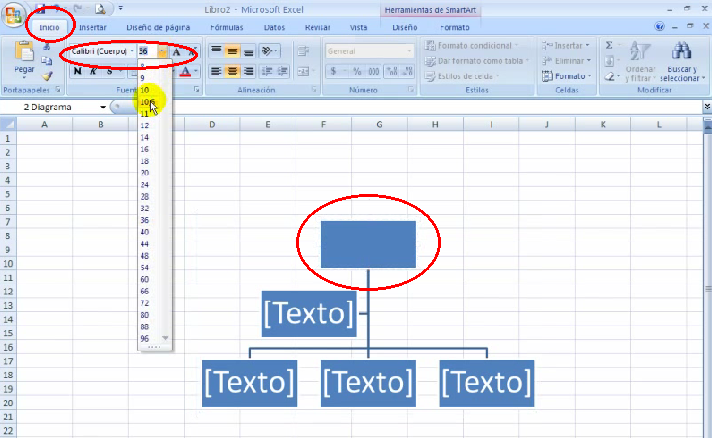 3.Para comenzar a escribir dentro del organigrama hacemos clic sobre el cuadro y para cambiar el formato de la letra, seleccionamos cambiar tamaño de fuente de la barra de herramienta.